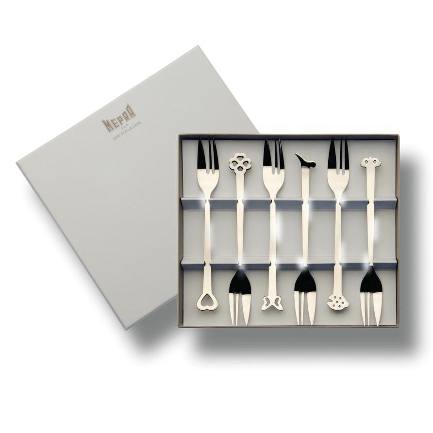 Realizzato a mano in Italia da MEPRA, questo set di mini forchette per antipasto Evento è un perfetto regalo di fidanzamento o matrimonio.